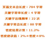 通过计算我们得到的关键词出现频率是22次。密度已经达到11.2% 可以说已经超标了,但是是否真的属于关键词密度过高呢,我们接下来分析百度的关键词密度算法。 (版权所有:雪域 北京信息网 转载请保留版权)