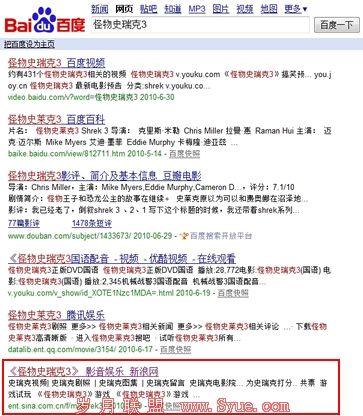 内容的建设应该是长效的,有针对性的,并且内容应该在广度和深度上提升,期望带来更好的阅读体验,这样才能真正将内容在搜索引擎中的权重提高。新浪网在专题制作上也是值得认真学习的,就拿百度搜索“怪物史莱克”,排名前两位都是百度的产品,暂且不表,三四五位依次是:豆瓣,优酷和腾讯专题,而新浪的内容专题就排在第六位,在原来百度未调整自身产品权重的时候,以及视频网站并未发力之前,新浪的娱乐类专题一直都是占据前三的位置。