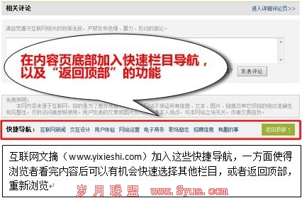 互联网文摘(www.yixieshi.com)加入这些快捷导航,一方面使得浏览者看完内容后可以有机会快速选择其他栏目,或者返回顶部,重新浏览互联网文摘在底部加入返回顶部的功能,主要也是希望用户尽量就用鼠标点击就能实现各个栏目的互通和当前页重新定位,而不是利用万恶的鼠标滚轮。