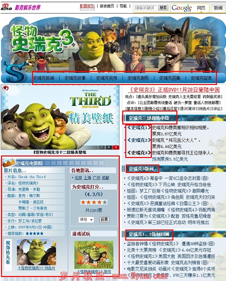 这是《怪物史瑞克》的新浪专题第一屏内容,在这里面,SEO理论同精心编辑的海量内容紧密结合起来: