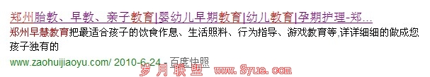 3.description描述设置,郑州早慧教育把最适合孩子的郑州胎教、郑州早教、郑州亲子教育、郑州婴幼儿早期教育、幼儿教育、孕期护理等,详详细细的做成您孩子独有的"教课书",让千百个家庭把育儿变成一种享受,让家长引领孩子走向成功!,这是郑州早慧教育网站现在的描述,之前的描述和这个是差不多的, 郑州早慧教育把最适合孩子的饮食作息、生活照料、行为指导、游戏教育等,详详细细的做成您孩子独有的“教课书“,让千百个家庭把育儿变成一种享受,让家长引领孩子走向成功!可以看出,我故意把饮食作息、生活照料、行为指导、游戏教育等这几个词换成了郑州胎教、郑州早教、郑州亲子教育、郑州婴幼儿早期教育、幼儿教育、孕期护理,尽管不是很通顺,但我要优化的几个关键词故意又在描述里重复了一遍,也就是说网站的关键字要在描述里面重复出现。