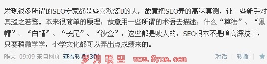 此话一出必然有正反两种答案,一种既是支持,另一种则是反对。虽然这位前辈对seo现状反应稍微有些强烈,不过确实这也是一个现状,我就记得刚接触seo时,看到这些“算法”、“黑帽”、“白帽”、“长尾”、“沙盒”之类确实有很多的问号,听上去seo就是一件很复杂的事情,让自己有些望而却步,不知道该如何下手,看见把这些词说得流利顺畅的就觉得是个高手了。不过说“小学文化都可以龙出点成绩来”又稍微有些不切实际。seo确实是一门学问,只有当融入进去后可能才能到达到以上发帖前辈的境界了吧,呵呵。