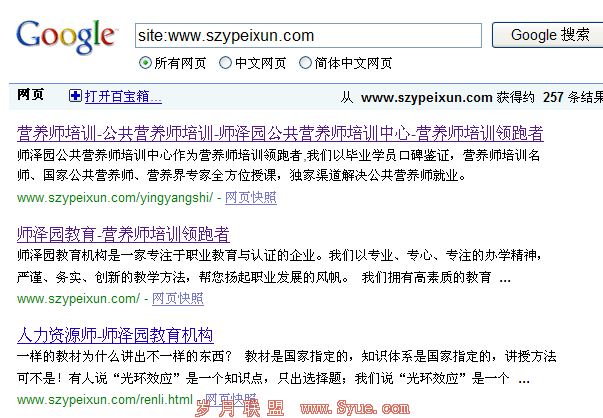 做了将近一个月这四个词在谷歌上就有排名了,刚发现的时候是在十几页,现在已都在前三页,而且营养师培训已经到了首页第五。由于营养师是属于公司项目之一,所以营养师只能做到了子目录下,其实这无形中就增加了优化的难度,因为这几个词竞争还是有的,而且很大,如果放在首页www.szypeixun.com 来做的话其实难度就大大降低了。