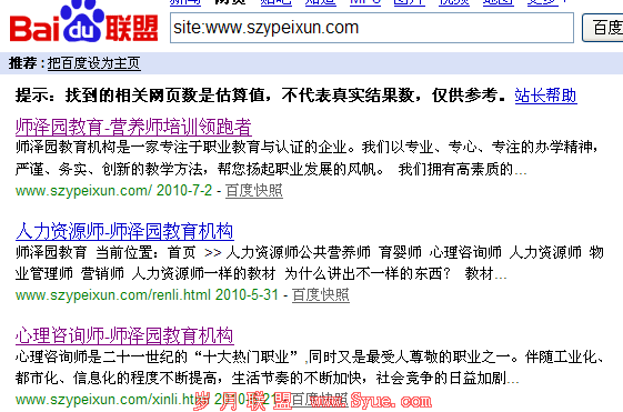 Google的速度确实惊人,让人很是欣慰。不过从中也体会出百度的严格!从这些天深刻的体会到了百度对于内容为王的事实,也确实存在一些另我们难以看透的迹象,该做的都做了,可www.szypeixun.com/yingyangshi 仍然在快照里不出现,其实这就需要坚持,需要耐心了……