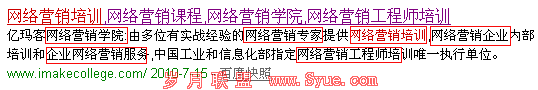 第二,关键词的位置,现在很多人都认为< meta name="keywords" content="" />没什么用了,确实我认为也没什么用了,很简单的一个道理,因为这里用户是看不到的,如果有用,你可能会乱来的。这里是“腐败”的温床,所以搜索引擎不给分,也是可理解的!但是说< meta name="description" content="" /> 没用了,我还是不敢苟同的,我要说的是它有至少个作用,它可以控制你想要给用户看到的描述,对核心关键词。也就是“领结”的支持作用。如果没有这个标签,搜索引擎会自动截取。效果也许不会很理想!关于关键词位置的安排,只要记住这句话,你可以尽得其精华,亿玛客网络营销学院一个不显山,不露水的高手冯斌老师给我指点了一句话:“在搜索引擎中眼中,任何一个词都是关键词,你要做的是要告诉搜索引擎你网站的关键词是什么”。至于怎么告诉搜索引擎,如网站的title、h1、h2等其他的还有很多!网站有很多这方面的资料,你去发现吧,我就不赘述了!