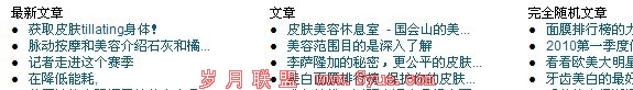 我第一个站的关键词是美白面膜排行榜第二个关键词做的是护肤品排行榜。前面一个词的百度指数是600多,后面一个词的百度指数,是900多,而且现在做这两个词的淘宝客又很多,可以看出两个词还是蛮有难度的。我把这个两个词做上去就的秘密武器就“更新带动器”。我的程序是用z-blog博客系统改的,下面的一排文字就是文章的标题,也就是所谓的“更新带动器“,如图所示: