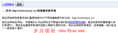 过个几分钟之后,在网站管理员工具后台会收到一封名为“针对 http://www.lenry.cn/ 的重新审核申请”的邮件,内容如下: