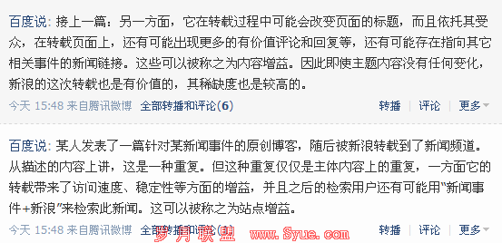 今天浏览微博,发现百度说更新的微博2条,这基本上解释了转载的文章为什么会比原创文章排名高的原因。