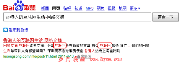通过上面两张图,可以看出我搜索的有两大关键词“互联网”和“香港人”,通过图二我们可以看出,这两个关键词在我列出的6大部分中都有显示,它们均 匀的分布在内容的各个部分,尤其是标题和title部分。当然由于我搜索关键词的问题,把整个标题都搜了一遍,所以分布的比较均匀。