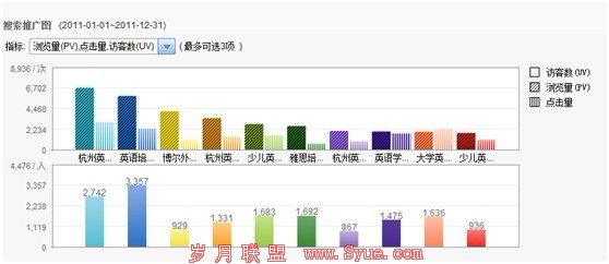新年初期我们不要先大幅度的去做关键词排名,因为很多网民的搜索习惯已经产生变化,所以我们要先总结去年关键词从排名、指数、点击转化方面。我们通过教育培训行业作为例子,可以利用百度统计工具查看,如图:
