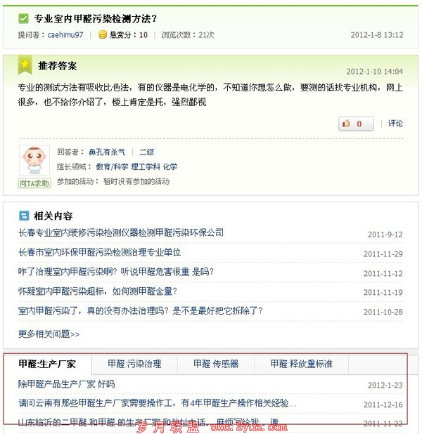 看到我用红框框着的部分了吗?这个是最新添加的(至于是什么时间上线的,我也不知道,反正现在有了)。这个是当我在百度知道里面搜索“甲醛”,随机找到的一个问题,然而在问题的下面,百度知道向我推荐“甲醛:生产厂家”“甲醛:污染治理”“甲醛:传感器”“甲醛:释放量标准”等四项,可谓是问题一网打尽。百度知道也在努力的将用户留住。