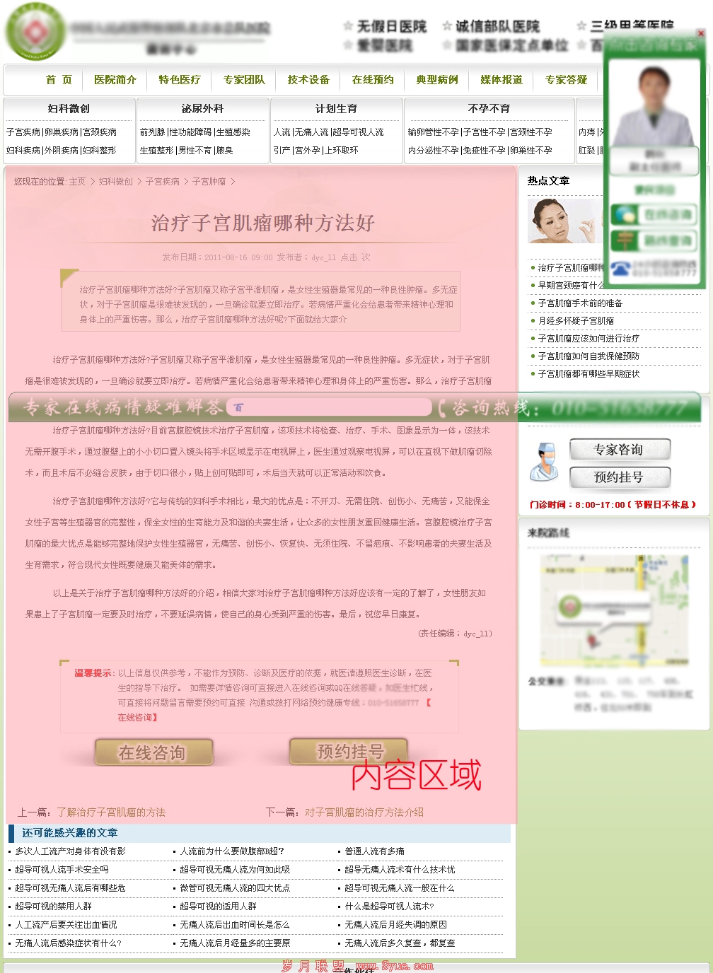 图4是某医院的“子宫肌瘤”的竞价着陆页。为什么说笔者最不推荐使用文章页做为竞价着陆页,原因有三:一、页面结构固定。全站文章页面布局相同且固定,整体页面最可能传达信息的区域就是内容区域,其他的诸如导航、logo、banner、其他文章标题列表都不能够给予用户足够的传达信息,无形中浪费了宝贵的竞价着陆页有限的空间;二、文章样式单调。一篇文章,不论有多少的配图,也不管有再多的修饰,文字始终都是主体部分。用户也许会在通过自然搜索进入的文章页停留以便获取达到浏览的目的,但不会在通过PPC进入的文章着陆页多做停留,一旦用户打开页面发现大篇幅的文字,就极有可能离开。三、不能帮助用户实现目的。如果用户搜索某个疾病的关键词或长尾词进入了竞价着陆页,就有可能发生转化,如果此时展现在用户面前的是以文章为主的页面,除非该页面能够满足用户最低但也是最急切的生理需求(笔者在《SEM之医疗SEO的目光 瞄准搜索引擎身后的用户》中提到过关于医疗网站给予用户需求的问题),否则用户就会因为诸如文章字数过多、表达不鲜明、没有找到想了解的内容等等因素离开,而无法产生转化。综上三点,笔者认为其实最根本的原因,还是文章页做为竞价着陆页来说,无法给予用户足够的体验度,不能充分表达传递信息,更何谈满足用户的需求了。