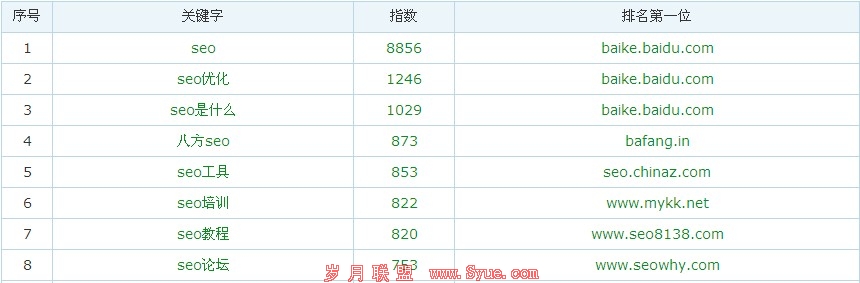 通过上面这张图可以看到关键词"seo"的指数达到8856,第二位“seo优化”指数1246,中间相差7000多,可见seo这个词受欢迎度极高,搜索和竞争也会极大。我们分析,通过搜索关键词,排在第一位的网站,图中指数最高的前3个词,排在第一位的网站都是baike.baidu.com。百科是百科旗下的产品,拥有的权重很高,这样就会很难竞争,这样的词虽然搜索量大,关注度高,但对优化来说很难,我们可以选择避过。