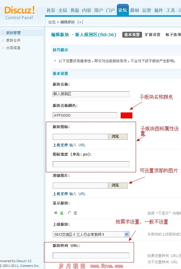分区子版块的设置方法和分区设置多几个功能需要设置,可以添加子版块图标,定义图标大小,顶部图片,子版块颜色,版块URL转向和规则等。如下图: