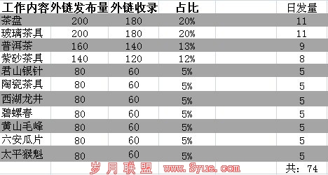 外链的发布必须有一个明确的目标,这可以让我们在外链资源上合理的分配,同时也方便我们对于外链这块数据的统计与分析,比如我们同时优化三个关键词:A、B、C,A关键词是竞争性最小的,B关键词竞争性是中等的,而C关键词是比较热门的,那么我们再外链的分配中就应该把重点任务放在C上面,最好能把这些关键词排名的网站进行一个分析,然后统计出大概我们每天应该给关键词发布多少外链,如图: