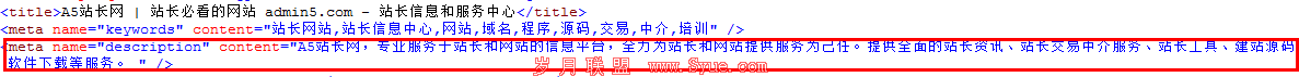 上图展示了A5站点的域名由2006年开始,一直处于站长型站点,从未变更过。这样的坚持运作是我们站长必须要学习的精神。而且从现在优化角度来看,A5的前期工作做得非常的足够。这点可以从他们关键词的设置,站点title的抒写以及域名的选取之中就可以看出。