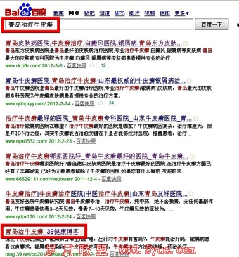 <2>将博客的标题设置为短词。我们拿“青岛治疗牛皮癣”这个词来举例,各位站长明显的可以看到有一个39博客排上来了。这就说明,一个博客的排名是非常高的,只要你使得博客每天快照,一定会有一个比较好的排名。
