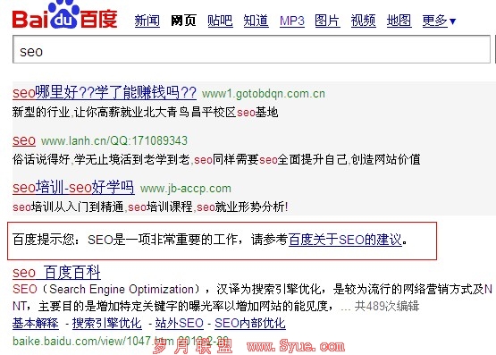 刚才用百度搜索“SEO”的时候发现百度又在自然排名下面友情提示了一句话,如图: