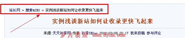 面包屑导航的重要性仅次于我们的主导航,面包屑不仅利于我们的优化,而且对于用户友好体验度也有很好的促进作用。那么在面包屑导航有细节我们需要注意呢?例如我们可以充分的将面包屑导航来提高站点关键词的排名,我们可以把我们的关键词与面包屑导航进行结合。我们看到目前很多站点的面包屑导航的首页的链接都是以“首页”来做锚文本,而我们可以将这个地方结合我们的关键词。例如A5站长网之前的面包屑导航为:网站首页» 搜索&SEO » 浅谈站内优化你我容易忽视的三点细节 ,而近期进行优化改成:站长网 » 搜索&SEO » 浅谈站内优化你我容易忽视的三点细节,.通过从细节处提升站点关键词的排名。如下图所示: