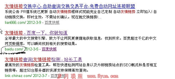 而地址是百度的首页地址,很明显百度的首页不论是标题还是关键词、描述或者内容都不可能存在“友情链接”这四个字,那为什么搜素这个关键词,百度的首页的标题前面会自动添加这个关键词呢。第一感觉就是外链的锚文本,大量锚文本关键词指向该地址。经过一个月的通过B2B网站内页实验,终于成功实现了标题前面自动添加关键词现实。