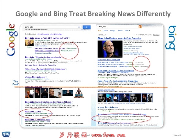 Optify公司CEO兼共同创始人布莱恩-戈夫曼(Brian Goffman )表示:“谷歌和必应都反映出他们对于重大新闻事件都是创造出不同的搜索结果页面。谷歌会更加倾向于优先考虑权威的来源,而相比之下,必应会有更多最新的消息,但是这些并不一定是高权威的。