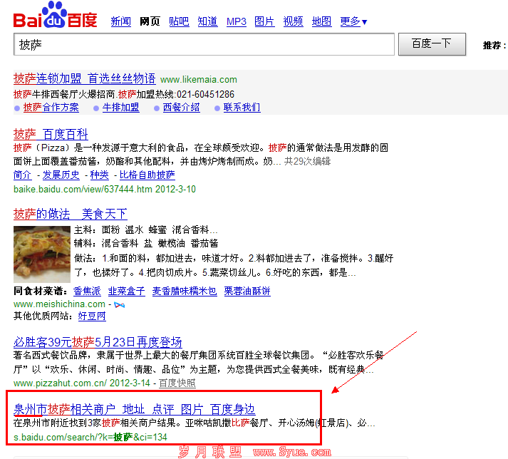 例子:笔者的IP地址属于福建泉州,然后笔者在百度上搜索“披萨”,而在搜索结果页面中第四位找到属于泉州地区的披萨店信息。