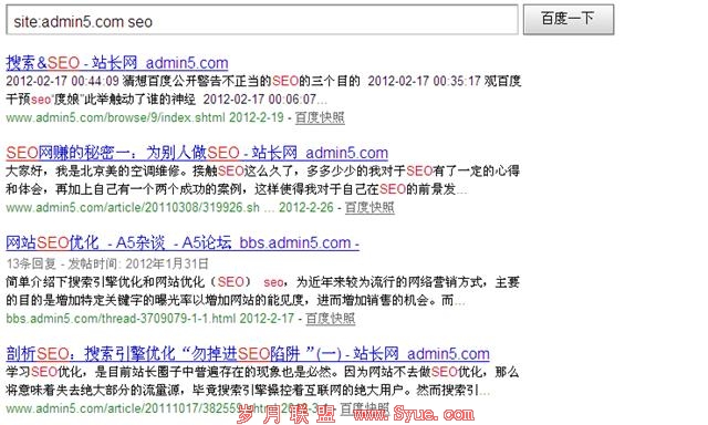 那么我们该如何来判断页面之间的相关性呢,其实在这里可以给大家一个思路,对相关链接最精通的就是搜索引擎了,这里我们以百度为例来说明,你可以利用百度对你页面的收录以及相关性来做好页面之间的相关性,例如,你可以使用site:admin5.com seo来判断在A5网站中,与SEO关键词最相关的页面,从而把这些页面之间互相链接。