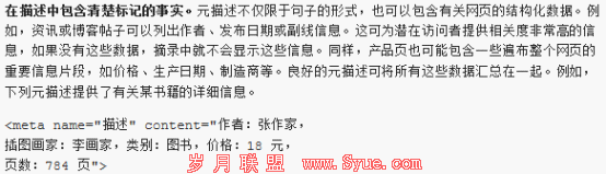 描述写得好,可以大大提高你的点击率的,这在谷歌的站长质量指南中,曾多次提到过,还有专门的章节来教我们如何写好描述,在创建描述的时候,每个网站的描述都应该是独特的,不要批量使用网一个描述,这样当搜索一个词,你的多个URL网页都有排名的时候,用户不知道哪个URL是它所最要的,在描述中,一定要把页面中最重的内容给展现出来,这样用户会去判断你的描述是否与它们的搜索词是最相关,从而决定是否点击你的网页,最好是要结构化你的描述,在描述中清楚的标记你页面的主要内容,例如谷歌提倡这样做: