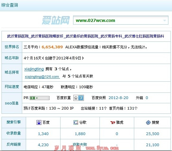 然后,研究了网站的关键词之后,笔者发现一个有趣的现象,那些关键词排名超过笔者的网站无一例外全是上线不到半年的新站,比如笔者做的“武汉胃肠医院”,25号以前笔者站一直稳居第三,前二的也都是一些上线一年以上的老站,本次更新后,两个不到5个月的站竟然都到了前二,他们的站点并无什么特色,内容处理也和笔者的站大同小异。真是令人匪夷所思。