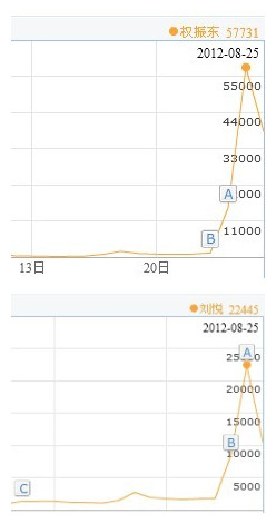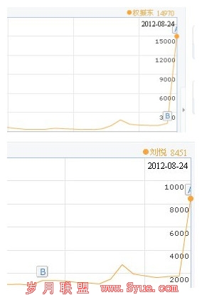 第一件事,可能因为某些原因没有显示,你懂的。但是第二条我记得只是早上显示了一会儿便没了。而那四条信息,却显示了整个下午!直到我下班回家吃过饭过后(9点左右),都还有三条显示在百度上,既然如此,那么我们来看看这几条信息都发生些什么变化呢!25号百度指数显示两个歌手的指数都翻了三四倍!几个万级左右指数的关键字,在短短一天时间就翻了三四倍,这真的只能用恐怖来形容!