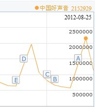 上周六(8月25号)下午,当我点开百度首页查看“十大实时热点”的时候,我突然发现了一个很奇怪的现象。十条热点推荐,竟然有四条都是有关《中国好声音》的!当时的我一个感觉就是,太恐怖了,这不会是“广告”吧?但是我又想到《中国好声音》本来就推广得非常成功,也不排除关注的人真的太多了吧。于是,我用百度指数挨个挨个那四条信息。因为图片较多,下面就主要展示其中两条信息。两位歌手的指数都挺高的!(8月24号)