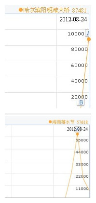 但是24号指数高的其它事件,可还有很多!比如说:“哈尔滨阳明滩大桥”和“海南嬉水节“,前者为87481后者为57618