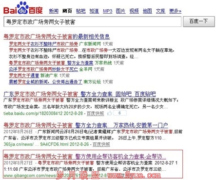 心动不如行动,于是经过编写与整合之后,标题改为“粤罗定市政广场旁两女子被害,警方使用企帮访客机全力查案”发表出去,百度蜘蛛非常给力,很快就收录了它。而且因为搜索量大,百度排名第四,如图所示: