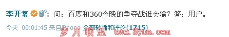 李开复大家都知道,他昨晚凌晨发了一条这样的微博:“问:百度和360今晚的争夺战谁会输?答:用户。”,以简短的话语对8月28日晚的360百度第二战做出评价,算是比较中肯的了!