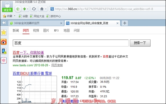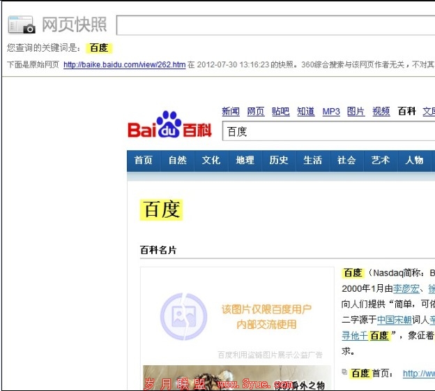 这个截图是笔者用360搜索,在结果中找到百度的产品时,点开就是这样,细心的读者会发现,这就是一个网页快照,而且快照日期显示的是2012年7月30日,距今已有一个月,这就是我们在360搜索结果中看到的实际例子,而非百度产品则显示正常。