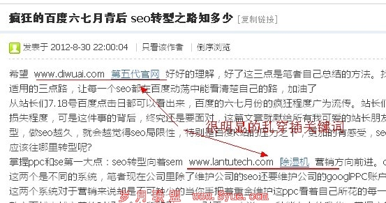 为了让外链发布了不被删除,只能发一些跟网站内容或板块相关的文章,但跟自己要做的关键词却沾不上边,只能在文章中随意的穿插关键词,或者在文章末尾随意堆积关键词,目的是为了提升更多的关键词的排名。但这种形式是百度杜绝的,这也是8月22日百度所打击的一种做法,完全属于乱穿插关键词,百度认为是一种欺骗搜索引擎,对用户没有帮助的做法。因此这种形式的外链同样是百度打击的一种。如图: