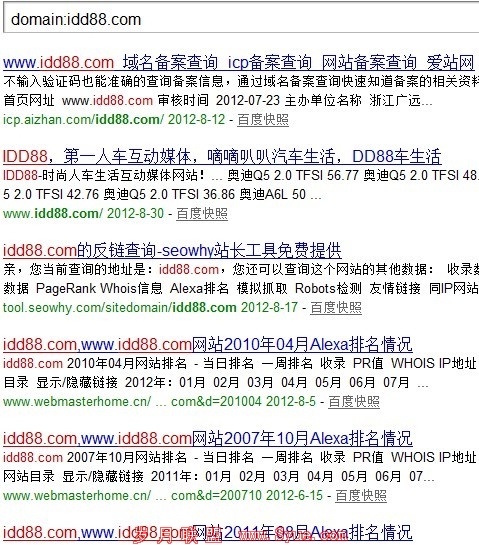 大家可以看出,除了百度的快照,就是这个站的排名,这外链做的极差,质量非常的低下,试问如何差劲的外链资源,如何才能提升你的网站?而且可能其中一个细节大家估计么看到,大家可以看上图,在domain:的命令之下,为何你的快照在别的页面之下,这更说明了你的站严重有问题大家不信可以试试自己的站,你用domain:命令之后,你的快照排在哪?