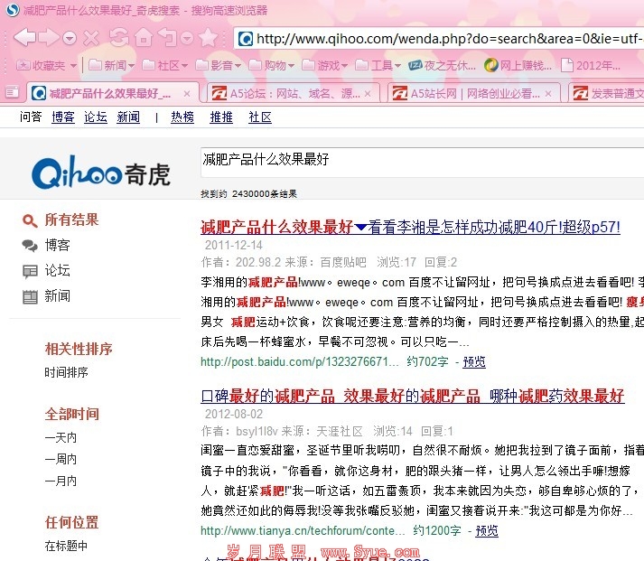 上面是360搜索的独立域名所展现出来的首页,现在我们开始点击左上角的问答看看,然后输入《减肥产品什么效果最好》。