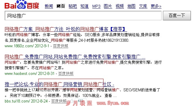 大家看到了吧,其实我们在百度搜索网站推广的时候,网站推广也一样标红提示的,就算28推标题中没有出现网站标题网站推广也是一样可以很好的优化。原因就是因为它们是同义词。