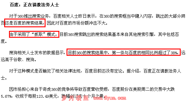a)360搜索:其实始终觉得应该感激360,在这样一个节骨眼上出现了这样的变化,不得不说和360搜索有千丝万缕的关系,其实笔者是觉得在前一段时间,百度就说过,360偷偷的抓取百度的搜索结果,然后直接上而不经过任何的思考,这些搜索结果包括title和网址,大家看以下的说明: