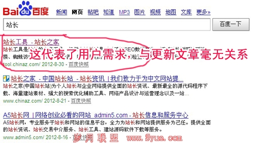 你在谁更新文章?如果你只是为搜索引擎更新文章,那应该停下来思考思考。最近降权的网站、可以看到有很多收录几十万上百万的网站关键词都去到了几百名外。网站更新,作为搜索引擎来说,只能是告诉你这个网站的活性,让搜索引擎经常过来索引你新的内容。而对于排名的作用,已经逐渐在降低了。从最新的网站排名观察,更多的是以用户的停留时间、回返比例、点入量、退出率为准,这也就是点击器能上到排名的原因。所以,在更新文章内容的时候、以这些因素作为基准,更能让网站的排名更为稳定。看看关键词“站长”排名第一的网站,根本无需更新一篇文章。