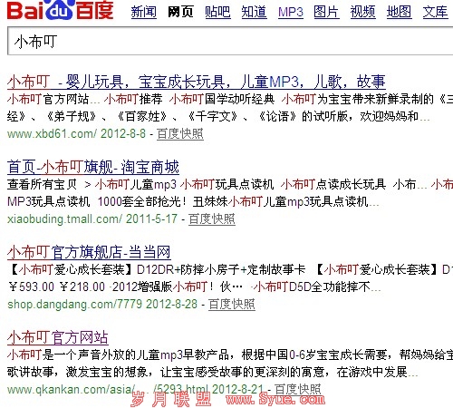 从上图可以看到,搜索“小布叮”的确其获得的应有的排名,但是请注意看第四项的,是一个网址导航的内页,至于为什么要看这个,我们可以换个词试试,搜索“小布叮官方网站”,注意这里是个不同字的词。结果页面可以看到,小布叮官方网站仍旧在第一位,而第二位的还是那个导航站的内页。如果说一个官方网站能够作为权威自然是没什么问题,但是一个毫不相关的网站导航的内页却也能获得差不多的待遇。同样,再搜索“小布叮官网”,可以看到,排在首位的仍旧不变,但是第三位出现了新的网站,是"小布叮官方网站"带index.html的那个首页。同样情况的还有当当网的小布叮网页,这三个关键词都在百度首页的3、4位徘徊。