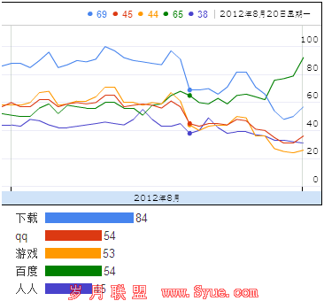 首先选取 Google 中国区搜索热词:下载、qq、游戏、百度、人人。查看近 90 天变化趋势。8 月 20 日下降最为明显,与 21 日媒体报道 360 系列产品默认搜索被更改基本吻合。另外,有触底反弹征兆,说明有些网民在被替换默认搜索引擎之后,会手动修改回来( 360 不会强制锁定综合搜索)。