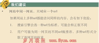 百度搜索引擎优化指南2.0给我们的建议是网站中同一网页,只对应一个url,而这两个页面看似一样并且同时都能访问,但搜索引擎或许会把它定义为两个不同的url,同时,多种url形式会分散了该网页的权重,当然这是在两个页面都收录的情况下;通过观察发现,百度对于这样不同的url,可能一开始两个都会收录,但后面通过调整只会收录其中的一个。如图百度的官方资料: