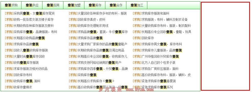 截图为搜索“童装”某一个站点的百度快照,我们可以看到在右边的红色方框中有一快空白的区域,而这一块区域中实际的页面是有包含童装的相关内容的。根据笔者的分析,这一块区域没有被很好的爬行的一个主要原因是页面超过搜索引擎规定页面的大小(百度收录页面大小约在150K左右)。而这也导致了超出这一大小的区域无法被很好爬行到。至此我们就可以根据这一问题对站点的页面进行一定的调整,提升页面的搜索引擎友好度。