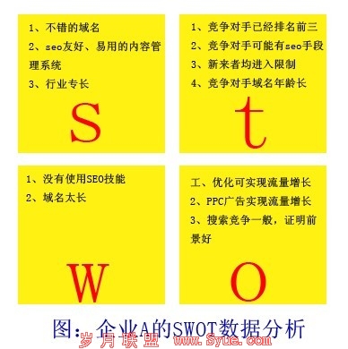 而seo中的swot分析方法可以分析自己网站,主要竞争对手,关键词,以及搜索引擎结果页面。比如,有个企业A用动易做了个网站,每天更新内容,介绍企业新息,网站域名意义上不错,但域名太长。因此企业A没有通过搜索引擎获得太多流量。但同行业的主要竞争对手B却通过搜索引擎获得大量流量,因为B企业不单域名开通时间长,也有一定的seo优化策略,但seo优化的水平有限,因此B企业主要还是通过域名年龄获得流量。