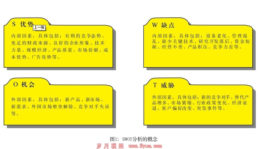 SWOT分析方法是一种企业战略分析方法,即根据企业自身的既定内在条件进行分析,找出企业的优势、劣势及核心竞争力之所在。其中,S代表strength(优势),W代表weakness(劣势),O代表opportunity(机会),T代表threat(威胁),其中,S、W是内部因素,O、T是外部因素。按照企业竞争战略的完整概念,战略应是一个企业“能够做的”(即组织的强项和弱项)和“可能做的”(即环境的机会和威胁)之间的有机组合。如图分析: