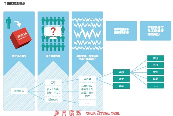 首先,在做客户区分的时候就会遇到很多困难。用户意图的识别会是一个非常纠结的过程。先不说用户本身根据年龄、性别、地域、收入等各种维度产生的差异,而且目前淘宝上还存在很多两人以上共用一个账号的情况,比如男女朋友,比如父母子女。这种情况导致他们的购买行为有时候在系统看来是“矛盾”的。如果系统识别你是女性,可是你却购买了男性的夹克,这时候系统就“傻眼”了。个性化搜索能做到的是,当默认你为女性时,你搜索“牛仔裤”,结果显示的大量产品为女性的牛仔裤,除非你键入的是“牛仔裤男”,那么系统就知道你是要为男性购买商品,它会遵照你的意愿来展示商品。