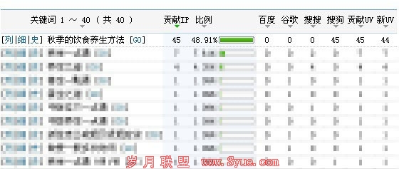 今天星期一,我还是跟往常一样,熟练的打开电脑(搞IT的都这样吧!),观察几个网站的流量排名等情况。小弟我勤勤恳恳,只是希望能业余时间挣点烟钱!我最近做了个养生类网站,叫养生一族养生网!做的时间不长,因为文章前一段时间被百度降权了,还处在恢复阶段,流量几乎甚小,没办法只能靠其他搜索引擎来流量了,因为新站,权重低,pr低,几乎靠长尾关键词很难获取好的流量(ps:降权的原因就是因为文章质量不高),平常精力也有限,更新和推广力度都不是很大。平常养生一族养生网也就一百左右的流量!不过最近几天,我为了恢复降权,也就随机写了几篇高质量的原创文章,关于秋季的,这不是马上快秋季了嘛!效果还真是不错,刚写完,搜狗反应也挺快,收录了,并且排名也不错!!一看51啦流量统计吓一跳,单纯一个关键词就给我带来了50多ip,并且是在搜狗搜索引擎,如果是百度,那流量肯定突飞猛进!如图:
