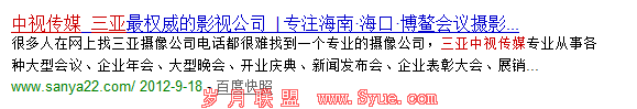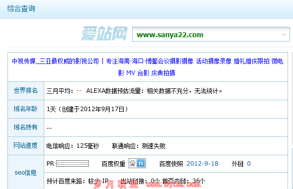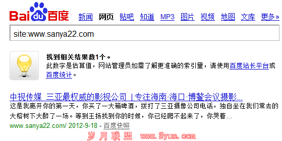 首先感谢admin5给我们这么一个很好的站长平台让我们学习到很多知识,自我介绍一下我是《三亚SEO实战基地:起点》2、3年前我发布了几篇文章,已经有好长时间没有写文章和站长们分享了。很多站长都说现在新站百度很难收录,有的都1个月过去了,有的甚至更长,今天很高兴抽空给新手站长写一篇新站快速收录的6大要点;site一下你的网站是否已经收录了,如果没有请继续往下看:那你现在可以site:www.sanya22.com他才上线一天而已;